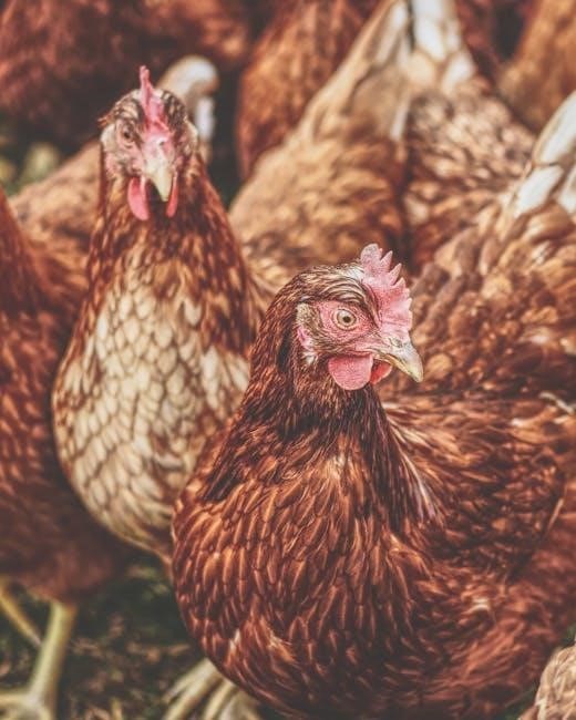 Poultry animals‚ such as chickens‚ geese‚ and ducks‚ are widely raised for eggs‚ meat‚ and feathers. Chickens are the most common‚ providing both eggs and poultry. Geese and ducks are valued for their meat‚ eggs‚ and down feathers. These birds are relatively easy to care for‚ requiring minimal space and specific diets. Poultry farming is a significant contributor to the agricultural economy‚ offering a reliable source of protein. Regular feeding‚ proper shelter‚ and health checks ensure optimal production. Poultry products‚ including eggs and meat‚ are staples in many diets worldwide. Their adaptability makes them suitable for both small-scale and large-scale farming operations‚ supporting livelihoods in rural areas.