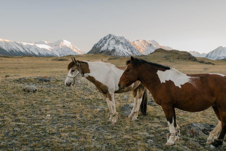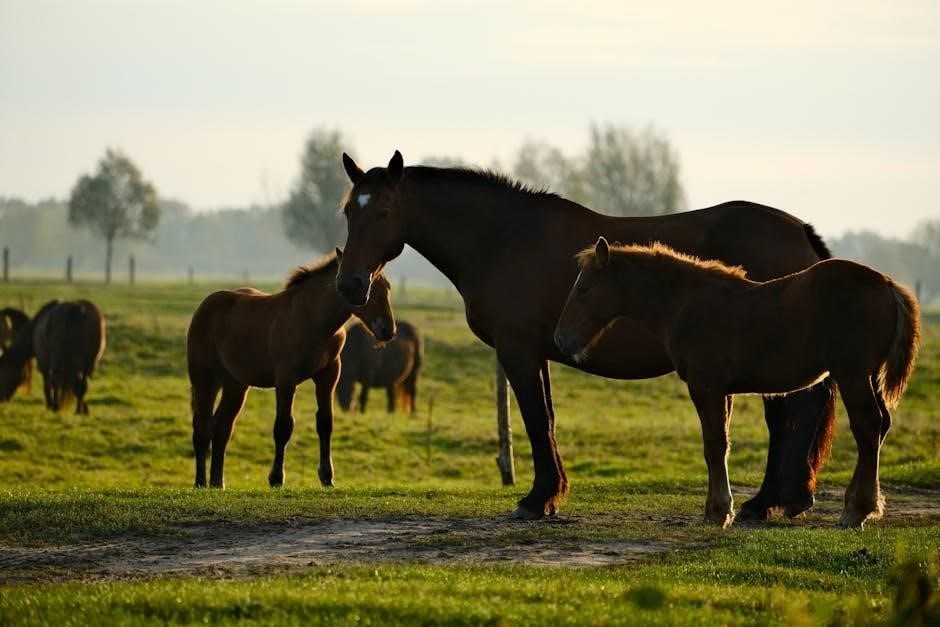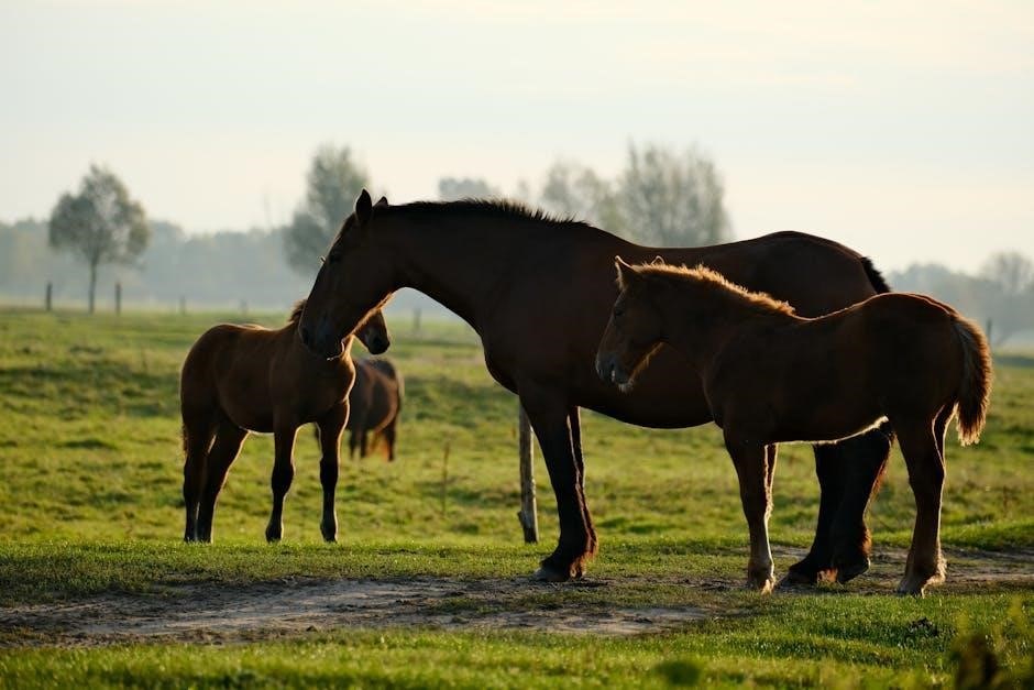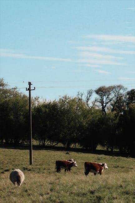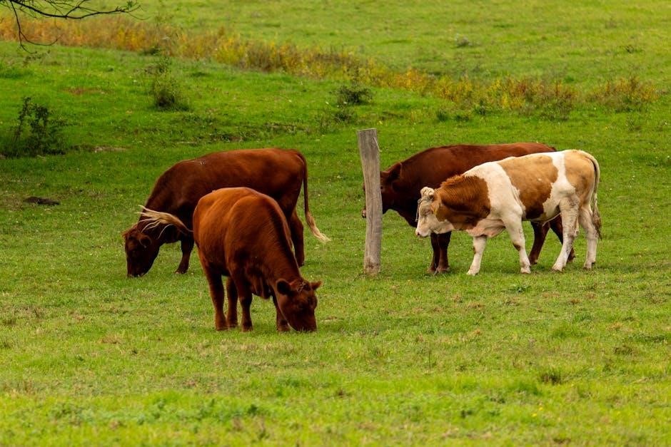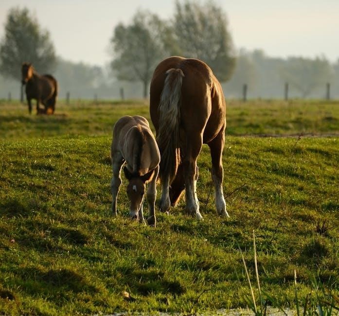 Grazing animals like horses‚ cows‚ and sheep primarily rely on grass and other vegetation for nutrition. Their digestive systems are designed to break down cellulose in plant material efficiently. Horses are obligate herbivores‚ requiring high-fiber diets rich in grass and hay. Cows‚ being ruminants‚ thrive on grasslands and legumes‚ while sheep prefer diverse pastures with grasses and broadleaf plants. Access to clean water and mineral supplements is essential for their health. Overgrazing can harm both the animals and the environment‚ making rotational grazing practices beneficial. Proper pasture management ensures optimal nutrition and sustains the well-being of these grazing farm animals.