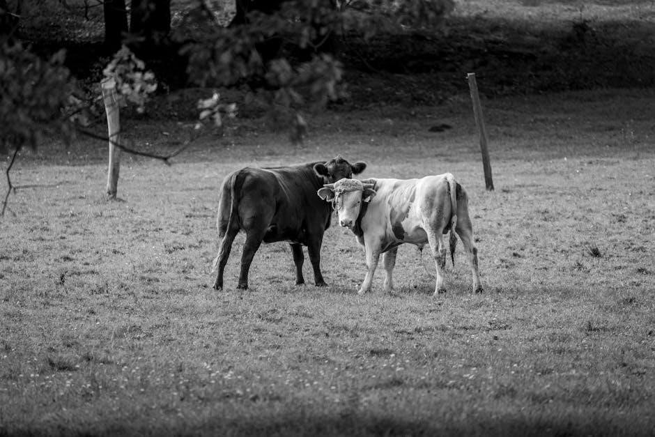 Livestock animals‚ such as cows‚ pigs‚ and sheep‚ are essential for agriculture‚ providing milk‚ meat‚ and wool. Cows are vital for dairy production‚ while pigs are primarily raised for pork. Sheep offer both wool and mutton‚ supporting textile and food industries. These animals are often grazed on pastures or fed specialized diets to enhance productivity. Proper care‚ including vaccinations and shelter‚ ensures their health and longevity. Livestock farming is a cornerstone of rural economies‚ supplying nutritious food and raw materials. Understanding their needs and management is crucial for sustainable farming practices. Farmers rely on these animals for livelihood‚ making them a fundamental part of agricultural systems worldwide;